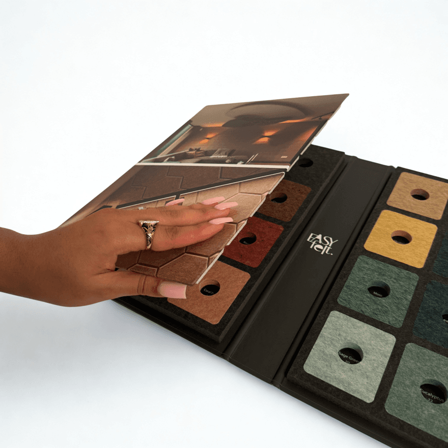 Met de samplemap krijg je een helder beeld van de structuur, dikte en kleurintensiteit van het vilt. Ideaal om mee te nemen naar projecten of om klanten te laten zien hoe veelzijdig PET-vilt kan zijn binnen interieurontwerpen.